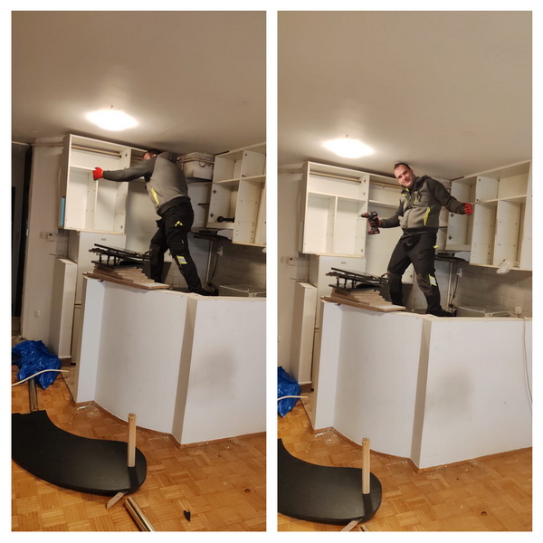 Demontaža i odvoz stare kuhinje. Zg dečki na demontaži i odvozu stare kuhinje koja mora otići kako bi nova kuhinja došla. Zg dečki iza sebe ostavljaju čist i uredan prostor koji je spreman za montiranje nove kuhinje.